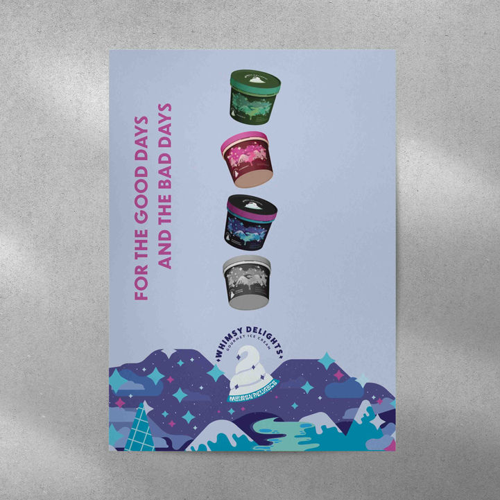 THE BRIEF/OBJECTIVE: Whimsy Delights is a personal portfolio project. Imagine a wizard creating his own ice cream company; this brand is the result of that.