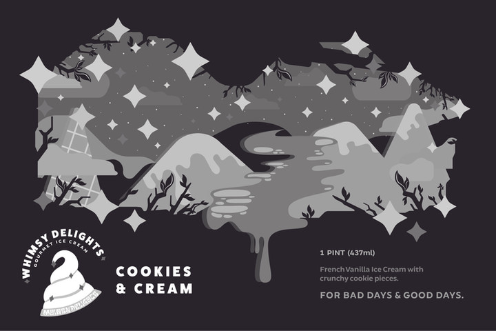 Concept Development: An ice cream forest was my chosen concept, and I wanted it to be something whose colors could be changed based on the flavor. I created the design in black and white, as seen in "Cookies and Cream," and then proceeded to add colors.